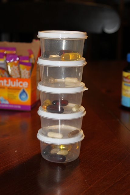 I bought these perfect little containers at the dollar store which are perfect for this purpose. I fill them up in the morning, that way, I never have to think about what I've taken and haven't taken.